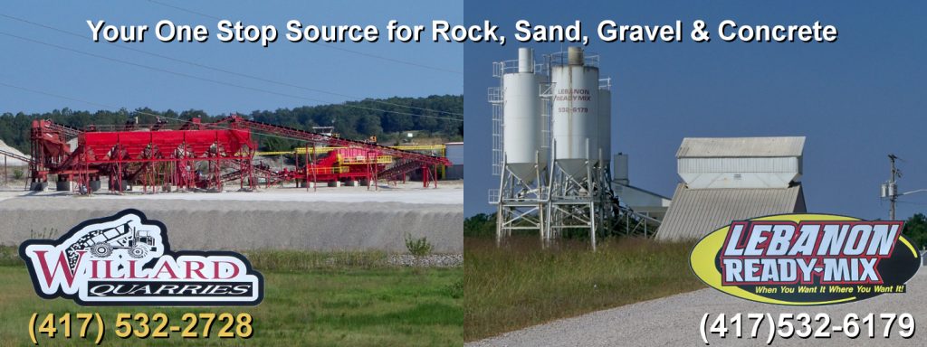 Both Willard Quarries and Lebanon Ready Mix are located in Lebanon Missouri. We also have a Willard Quarries location in St. Robert. Between our quarries and our ready mix facility, we’re able to offer everyone from homeowners to contractors everything they need to complete their projects.